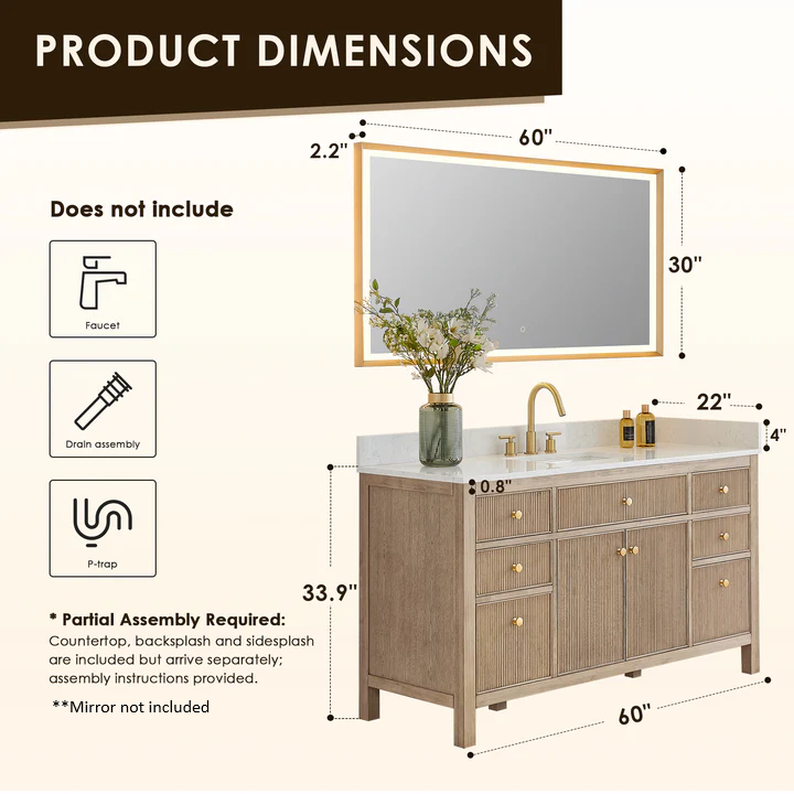 - Partial Assembly Required: Countertop, backsplash and sidesplash are included but arrive separately; assembly instructions provided