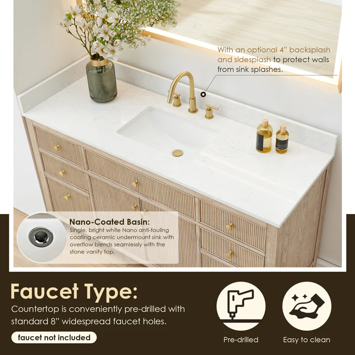 - Sleeking Top: 0.8”-thick, Grain White engineered stone countertop provides a clean and elegant look, with an optional 4” backsplash and sidesplash to protect walls from sink splashes