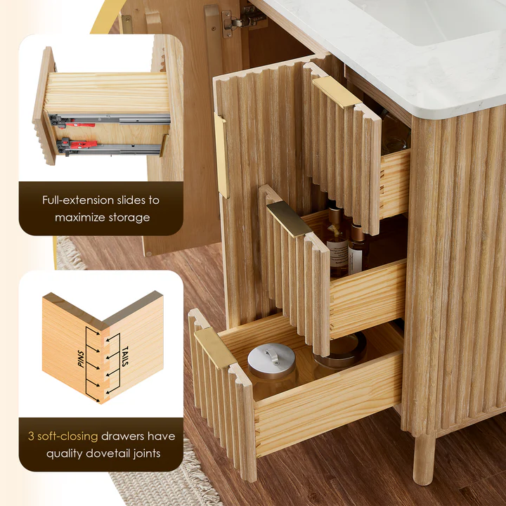 • Timeless Design: Reeded design on cabinet front panels and sides adds depth and dimension, accented by contemporary invisible door handles and drawer pulls in an opulent Brushed Gold finish