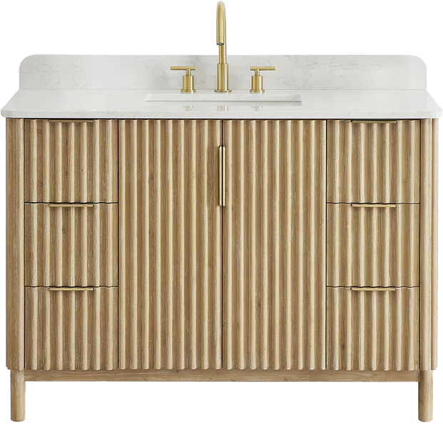 • Sleeking Top: 0.8”-thick, Grain White engineered stone countertop with rounded edge provides a clean and elegant look, with an optional 4” backsplash to protect walls from sink splashes
