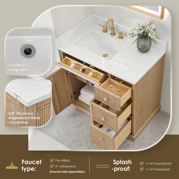 - Durable Top: The 0.8"-thick engineered stone countertop features a non-porous surface with delicate veinings, a matching 4" backsplash and sidesplash to protect surrounding walls.