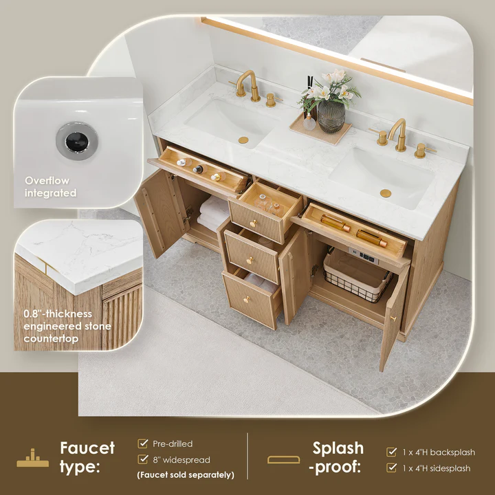 - Faucet Type: Pre-drilled standard 8" widespread faucet holes for easy installation. (Faucet sold separately)