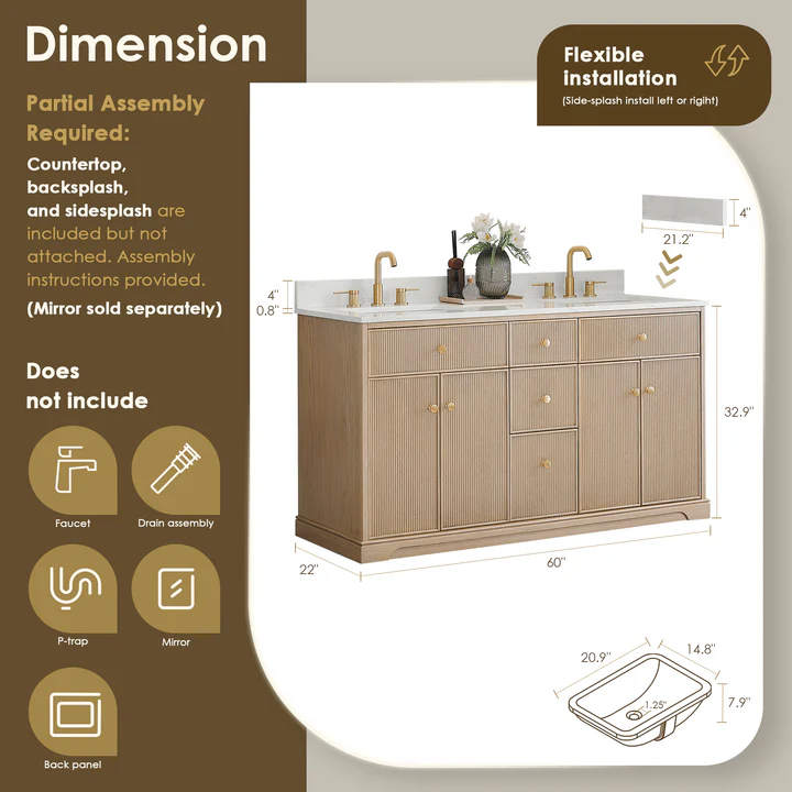 - Partial Assembly Required: Countertop, backsplash, and sidesplash are included but not attached. Assembly instructions provided.
